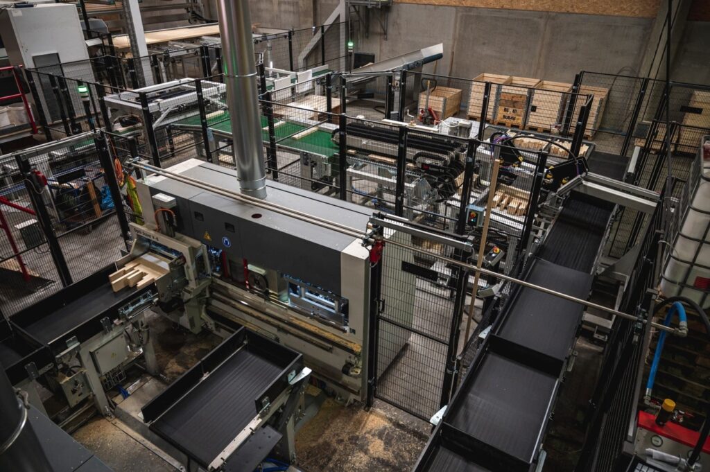 Jedes Brett wird in Linie voregalisiert und nach Schnittliste des Scanners mit bis zu 185 Schnitten/min gekappt. Die Kappstücke laufen über eine Fräse und werden mit 140kN abgelängt verpresst.