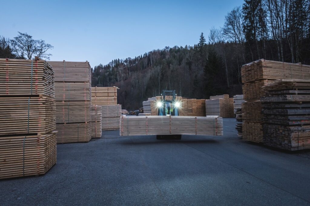 Ein Radlader, drei Frontstapler sowie fünf Seitenstapler brauchen wir zur Bewegung von Rundholz, Schnittholz und Restholz im Produktionsbetrieb.