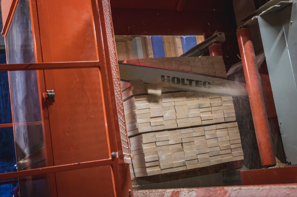 Im Sägewerk werden sämtliche Stämme auftragsbezogen zu Brettern, Dielen und Kanthölzern eingeschnitten. Über die Vorsortierung am Rundholzplatz wird für jeden Auftrag der passende Stamm verwendet.